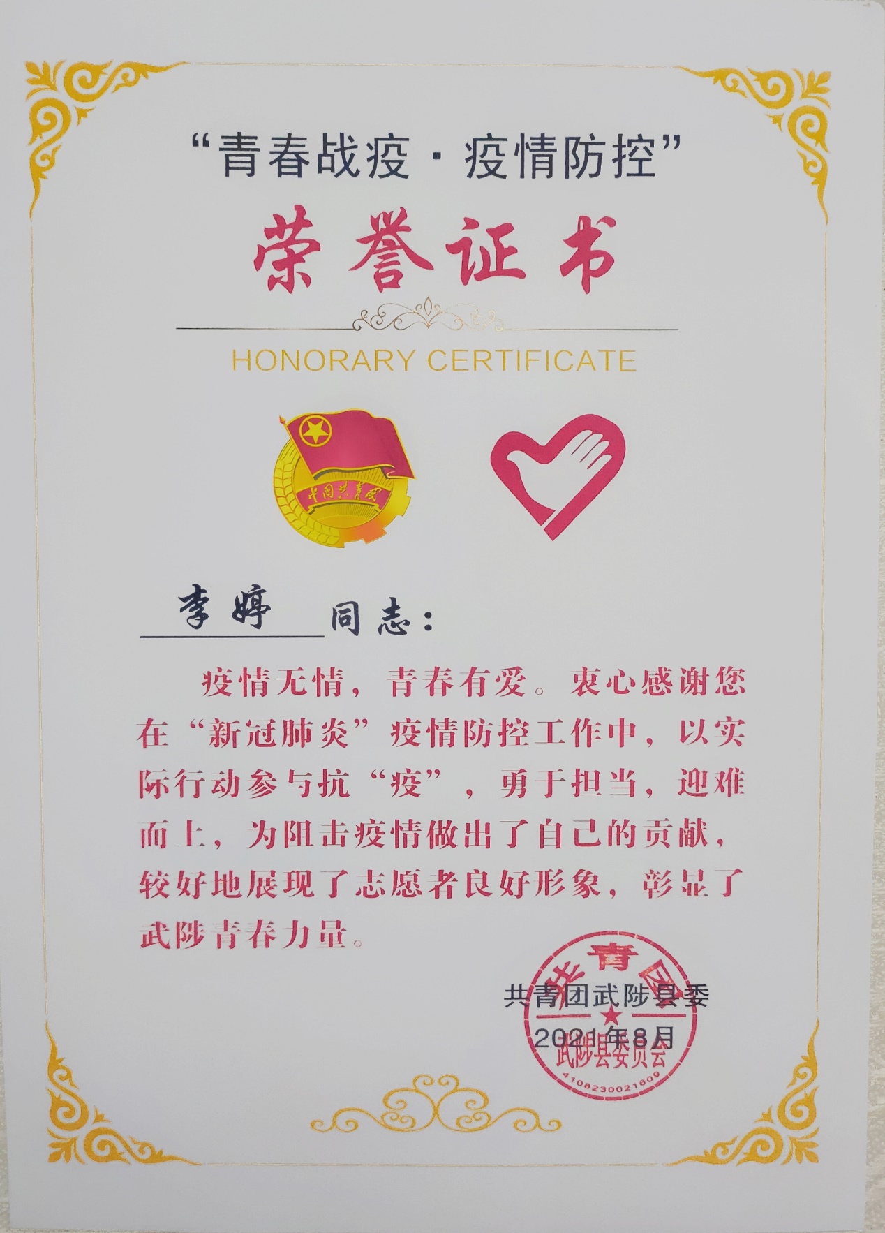 她虽然是众多大学生志愿者的小小一员,但却尽自己所能为人民、为社会、为国家贡献出微薄之力。她作为一名共青团员,用实际行动追随党与共青团的精神号召,展现了新时代青年的精神面貌,在防疫工作中留下了属于自己的印记,散发出耀眼而璀璨的光芒。