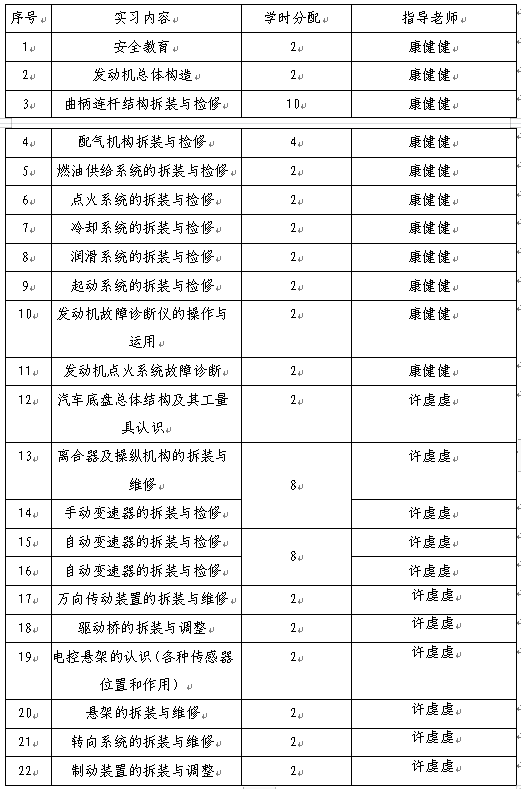 汽车拆装实训是汽车服务工程技术专业学生在校学习理论课程和实验课程的同时,按照专业人才培养方案进行课程实习和实践技能训练,主要是对汽车整车进行拆装实习。为了圆满完成实习任务,保证实习质量,具体安排如下: